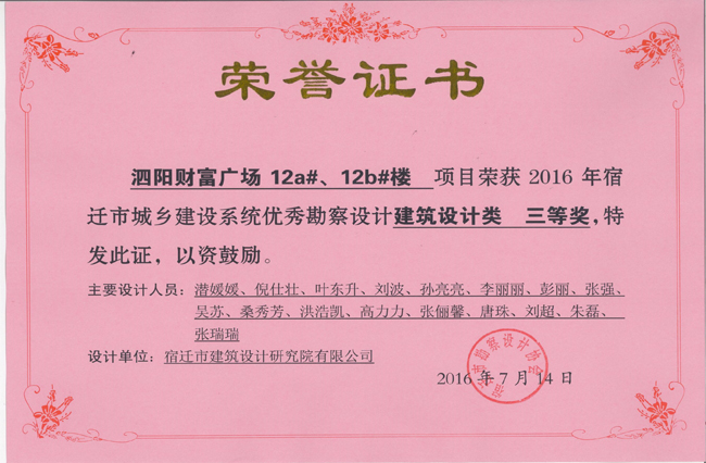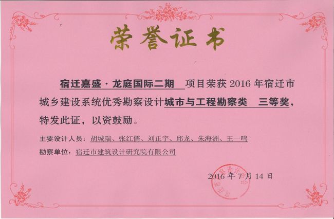 2、宿遷嘉盛‘龍庭國際二期項目中獲城市與工程勘察類三等獎